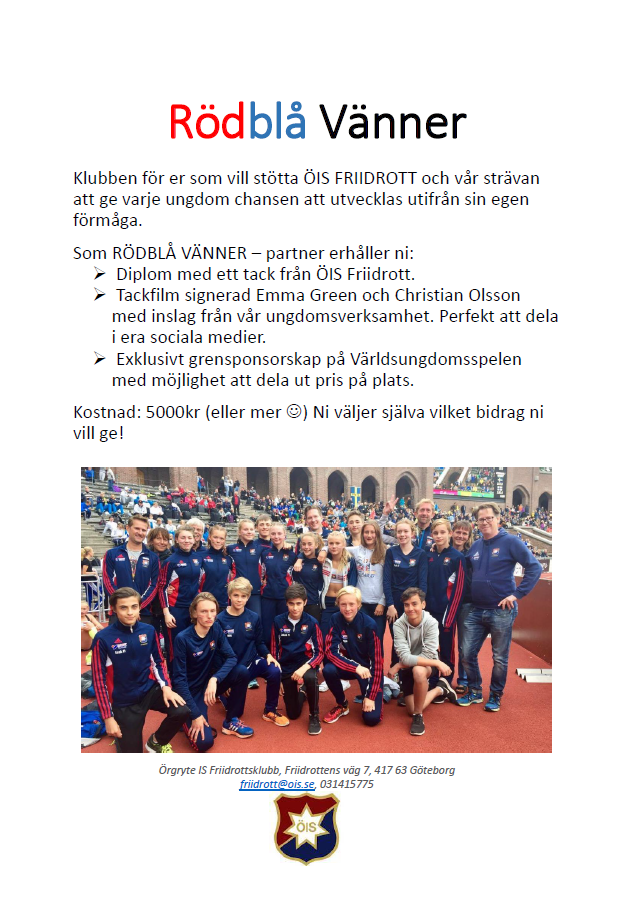 Här nedan kan ni också läsa om vårt populära koncept RÖDBLÅ VÄNNER. Ett koncept för dig som har ett hjärta som klappar lite extra för ÖIS FRIIDROTT. Företag sponsrar med minst 10 000 kr och privatpersoner med minst 5 000 kr för detta koncept!